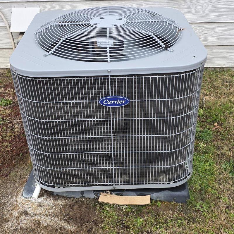 Mission Critical Comfort Solutions serviced a Carrier HVAC unit in Lumberton, NC. The work included inspection and maintenance of the outdoor condenser unit, electrical wiring with capacitors, and compressor components. The unit was placed on a level base pad with visible drainage piping for condensate management.